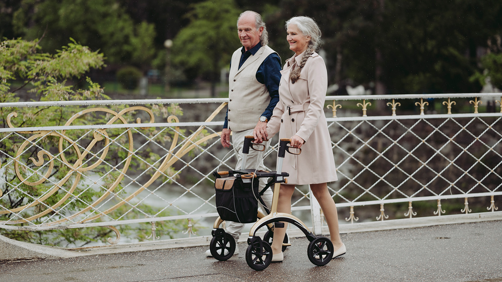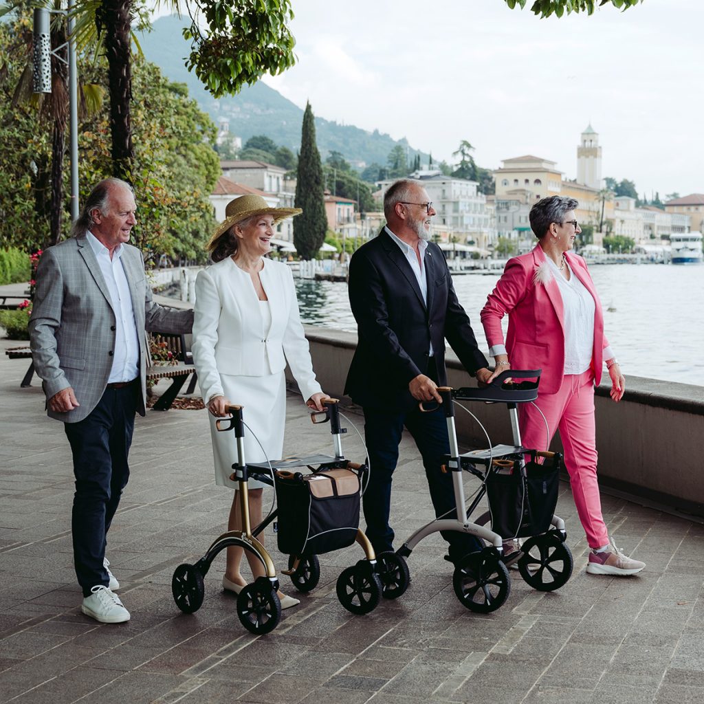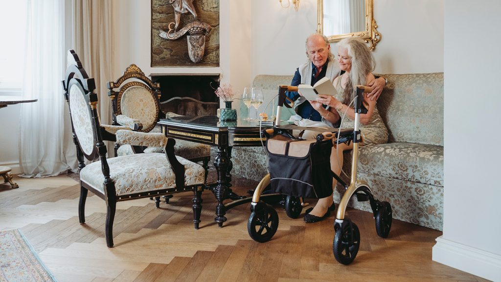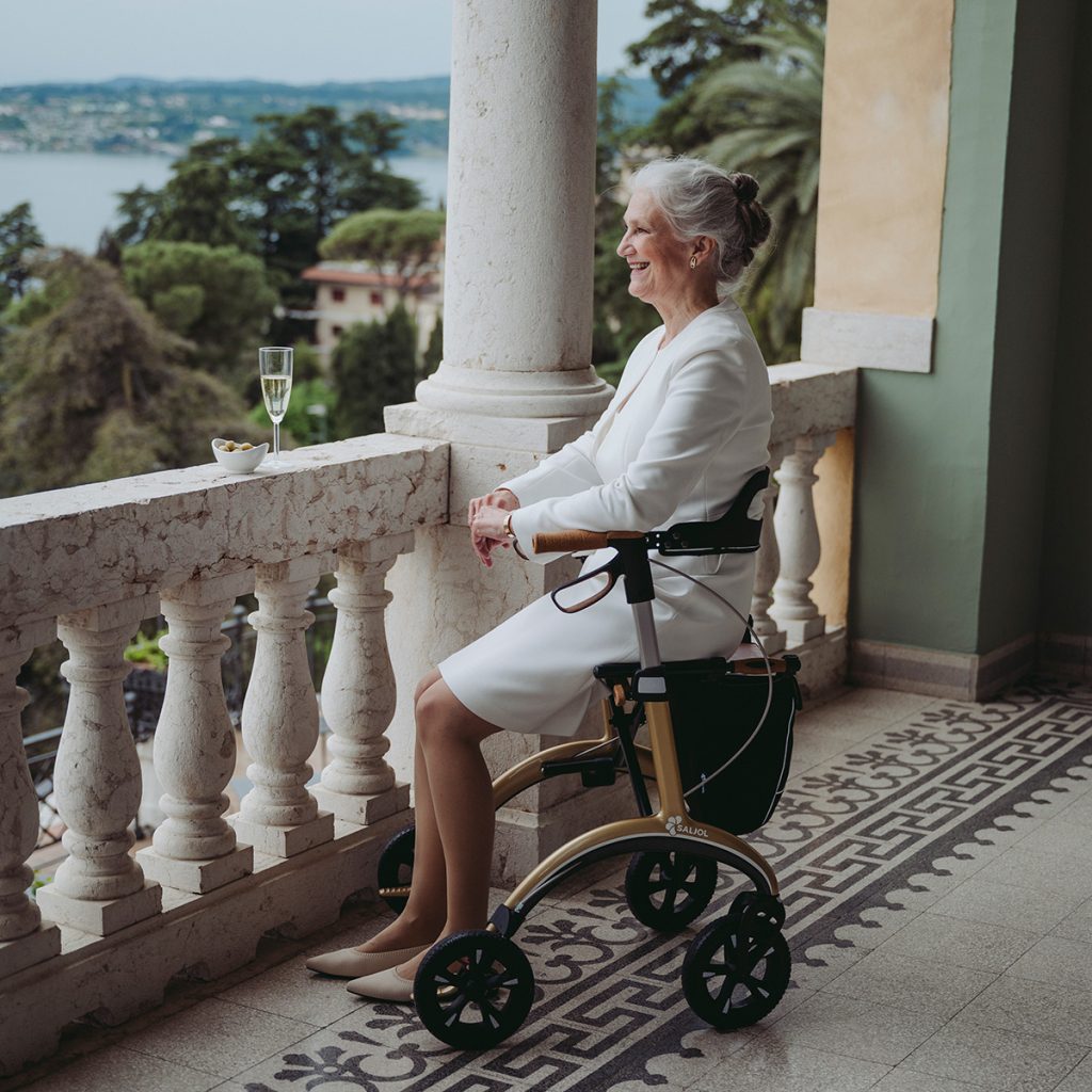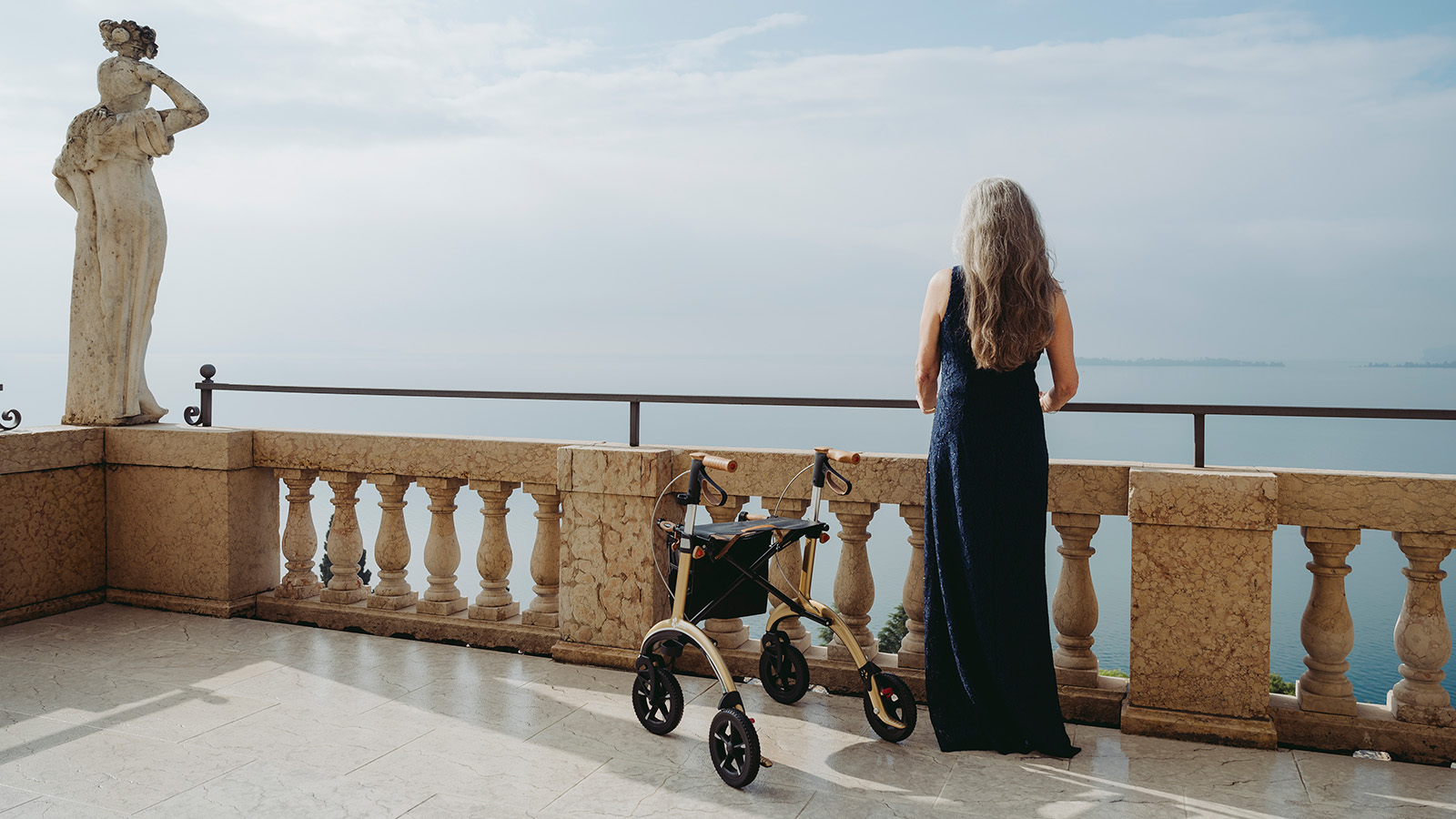 Proudly, she now sits on the rollator, eager to take her first steps with it. She starts to dream – perhaps she could go to the theatre again? Maybe even venture on a city break?